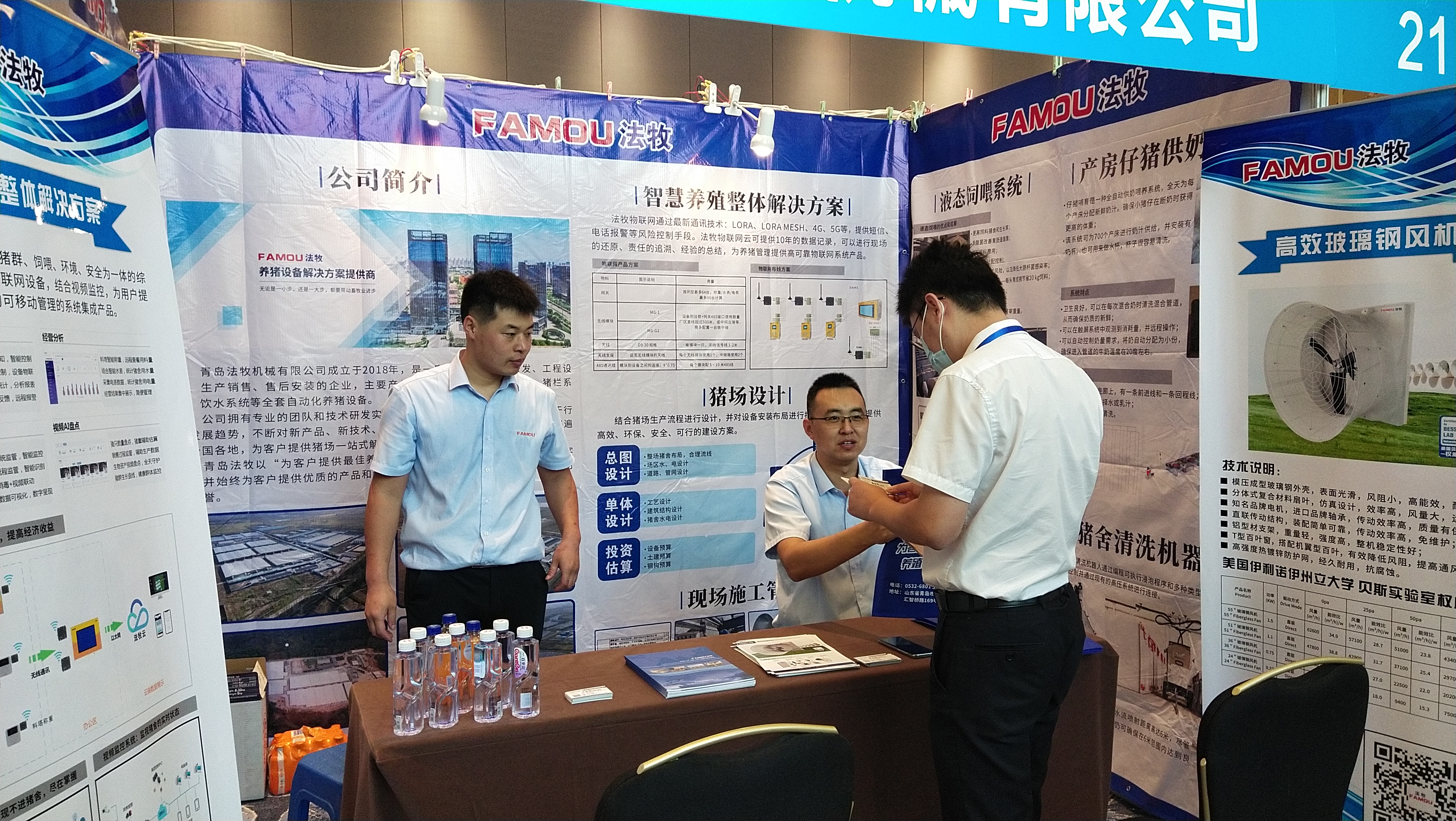 青岛法牧展位上,参观人员络绎不绝,法牧智慧养殖整体解决方案、高效玻璃钢风机等产品吸引了众多参会嘉宾的交流与咨询,现场交流气氛活跃。工作人员为每位参展者详细介绍了产品的功能特点与技术优势,并得到高度认可。